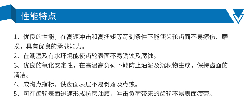 ●優(yōu)良的抗磨性,在高速?zèng)_擊和高扭矩等苛刻條件下能有效地防止齒輪齒面的擦傷、磨損,具有優(yōu)異的承載能力。