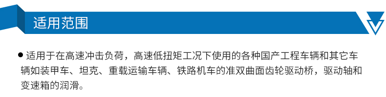 ●適用于在高速?zèng)_擊負(fù)荷,高速低扭矩工況下使用的各種進(jìn)口、國產(chǎn)工程車輛和其它車輛如裝甲車、坦克、重載運(yùn)輸車輛、鐵路機(jī)車的準(zhǔn)雙曲面齒輪驅(qū)動(dòng)橋,驅(qū)動(dòng)軸和變速箱的潤滑。