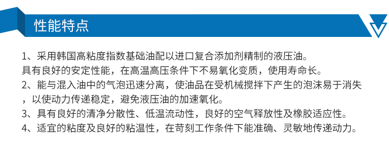 ●采用韓國高粘度指數(shù)基礎(chǔ)油配以進口復(fù)合添加劑精制的抗磨液壓油。