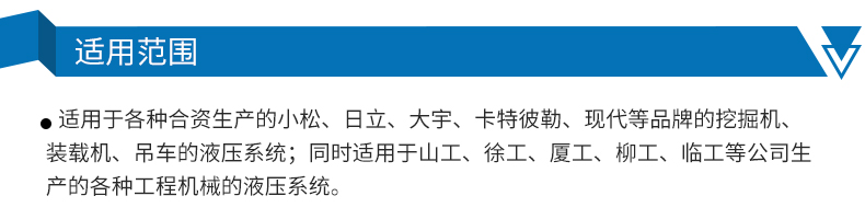 適用于各種進口及合資的小松、日立、大宇、卡特彼勒、現(xiàn)代等品牌的挖掘機、裝載機、吊車的液壓系統(tǒng);同時適用于山工、徐工、廈工、柳工、臨工等公司的各種工程機械的液壓系統(tǒng)。
