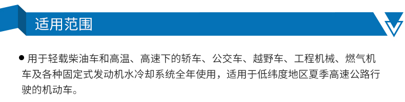 ●用于輕載柴油車和高溫、高速下的轎車、公交車、越野車、工程機械、燃氣機車及各種固定式發動機水冷卻系統全年使用,特別適用于低緯度地區夏季高速公路行駛的機動車。