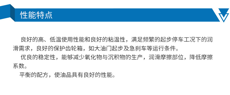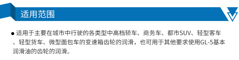 ●適用于主要在城市中行駛的各類型轎車、商務(wù)車、都市SUV、輕型客車、輕型貨車、微型面包車的變速箱齒輪的潤滑,也可用于其它要求使用GL-5級(jí)別潤滑油的齒輪的潤滑。高、低溫使用性能和較好的粘溫性,滿足頻繁的起步停車工況下的潤滑需求,良好的保護(hù)齒輪箱,如大油門起步及急剎車等運(yùn)行條件;